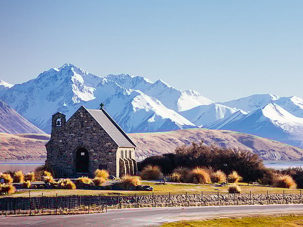 Arrive at Lake Tekapo, where glacial waters glow an impossible blue. Visit the Church of the Good Shepherd, positioned at the lake’s edge beneath snow-capped peaks — one of New Zealand’s most photographed alpine scenes.