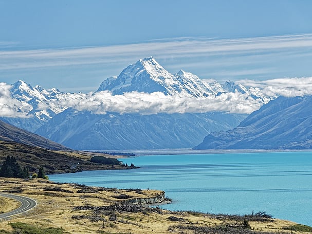 Follow the luminous shoreline of Lake Pukaki toward Peter’s Lookout, where the iconic alpine highway unfolds beneath the towering presence of Aoraki / Mount Cook. This is one of the South Island’s most cinematic perspectives.
